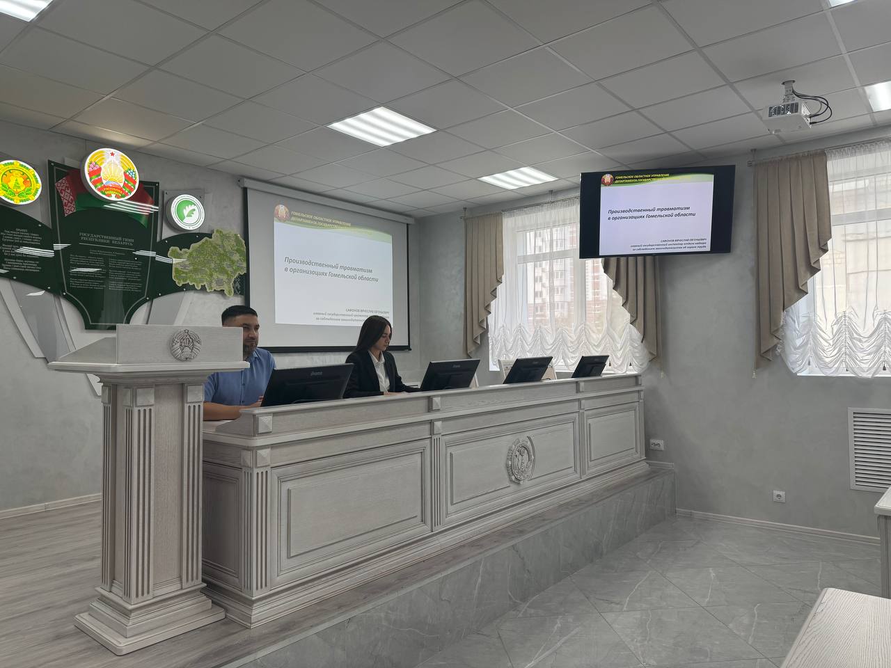 Размаўляючы са спецыялістамі, прадстаўнік Дэпартамента расказаў аб сітуацыі, якая склалася ў Гомельскай вобласці па вытворчаму траўматызму, а таксама аб сітуацыі з вытворчым траўматызмам у арганізацыях, падпарадкаваных Гомельскаму ДВЛГА. Прывёў прыклады шэрагу няшчасных выпадкаў на вытворчасці, у тым ліку прыклады выпадкаў, калі пацярпелыя знаходзіліся на працоўным месцы і ў працоўны час у стане алкагольнага ап'янення.